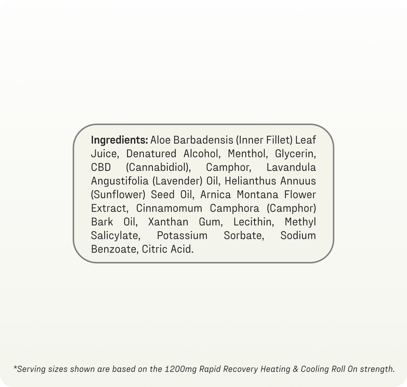 Aloe Barbadensis (Inner Fillet) Leaf Juice, Denatured Alcohol, Menthol, Glycerin, CBD (Cannabidoil), Camphor, Lavandula Angustifoila (Lavendar) Oil, Helianthus Annuus (Sunflower) Seed Oil, Arnica Montana Flower Extract, Cinnamonum Camphora (Camphor) Bark Oil, Xanthan Gum, Lecthin, Methyl Salicylate, Potassium Sorbate, Sodium Benzoate, Citric Acid.
