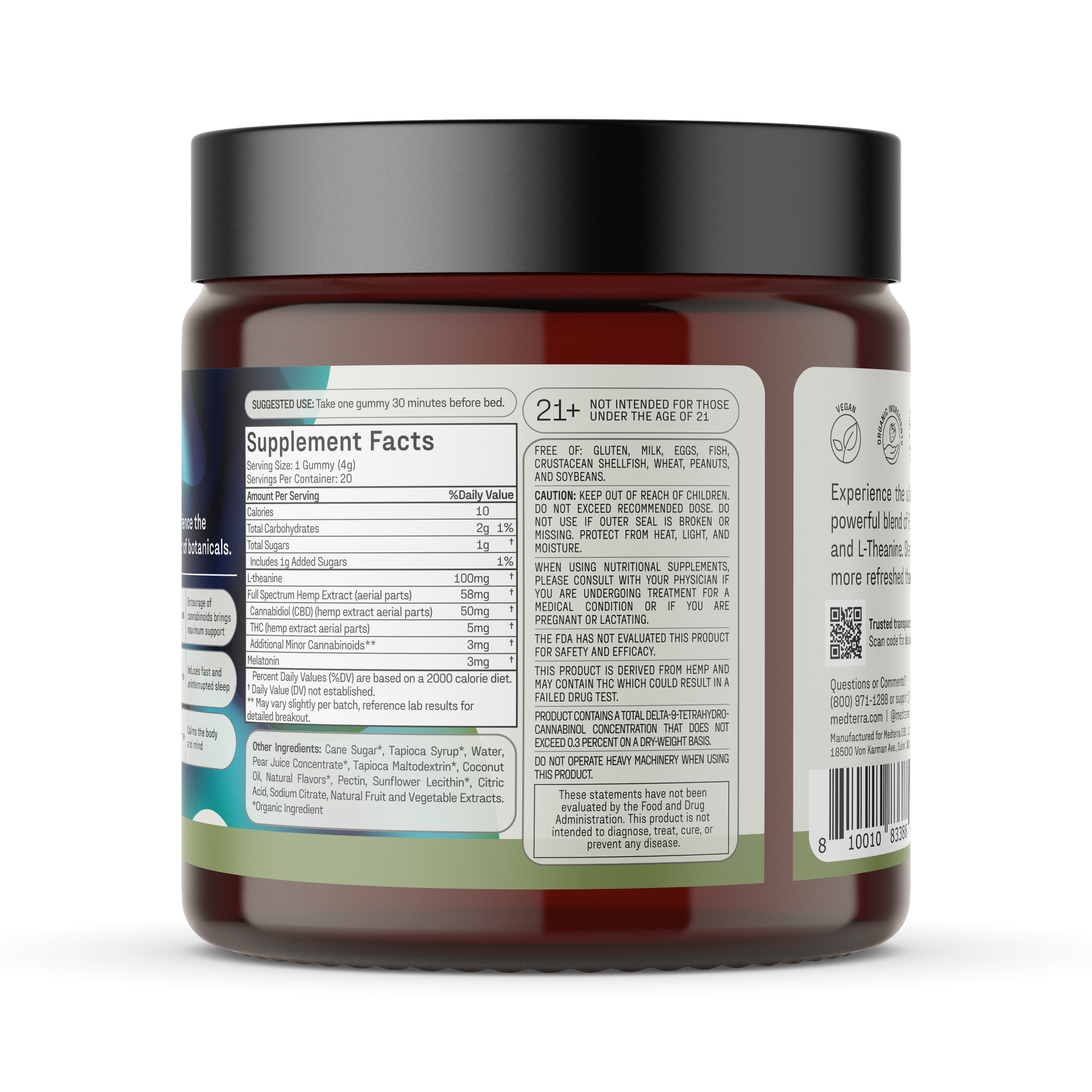 L-Theanine 100mg, Full Spectrum Hemp Extract (from hemp extract aerial parts) 58mg, Cannabidiol (CBD) (hemp extract aerial parts) 50mg, THC (from hemp extract aerial parts) 5mg, Additional Minor Cannabinoids(from hemp extract aerial parts) 3mg, Melatonin 3mg